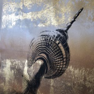 „Fernsehturm 8 – Golden View“ ist eine ausdrucksstarke Hommage an den Berliner Fernsehturm – neu gedacht in einer vielschichtigen Mixed-Media-Technik aus Serigraphie und Malerei. Die markante Perspektive verleiht dem Motiv eine fast skulpturale Präsenz, während die goldene Oberfläche je nach Lichteinfall subtil changiert und dem Werk eine außergewöhnliche Tiefe gibt.