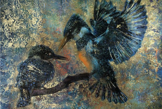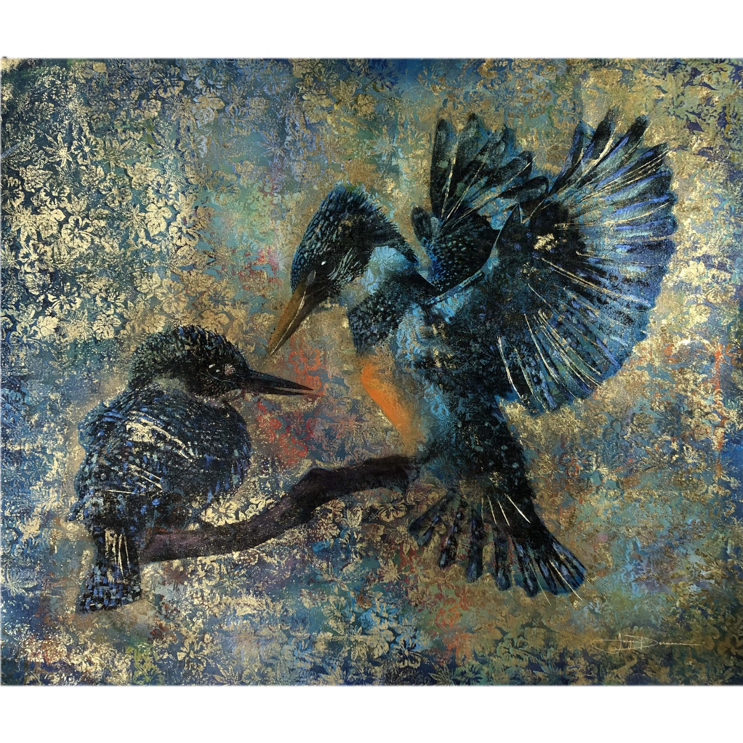 Der Eisvogel gilt in der Kunstgeschichte als Symbol für Frieden, Beständigkeit und die schöpferische Kraft des Lichts. Seine schillernden Farben stehen für Klarheit, Erneuerung und die Verbindung zwischen Wasser und Himmel – zwischen Tiefe und Freiheit. In dieser Arbeit verschmelzen viele  Schichten und malerische Texturen zu einer vielschichtigen Komposition, die den Moment des Innehaltens zwischen Bewegung und Ruhe festhält